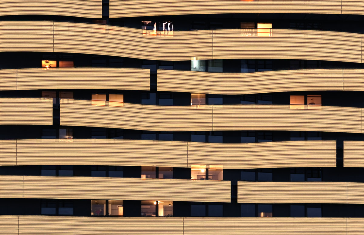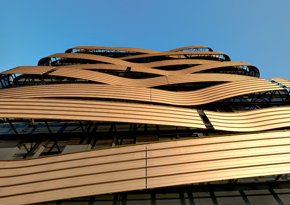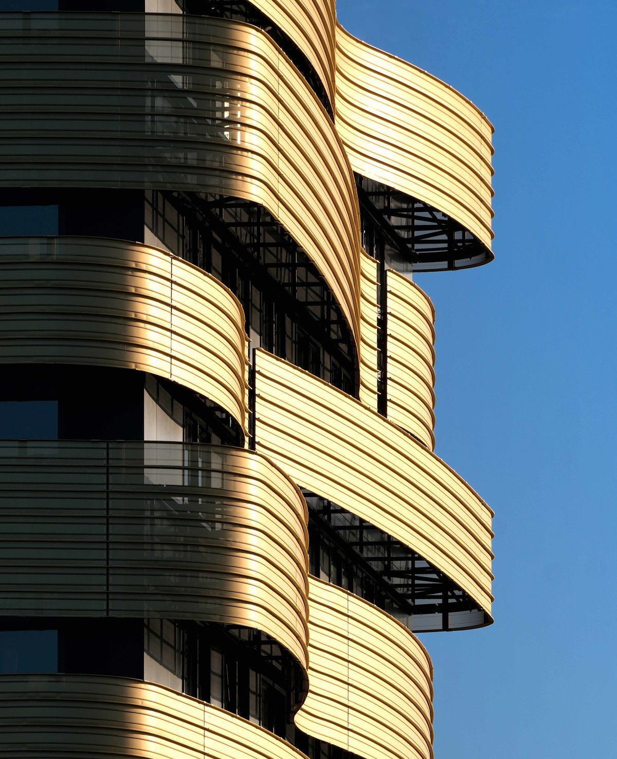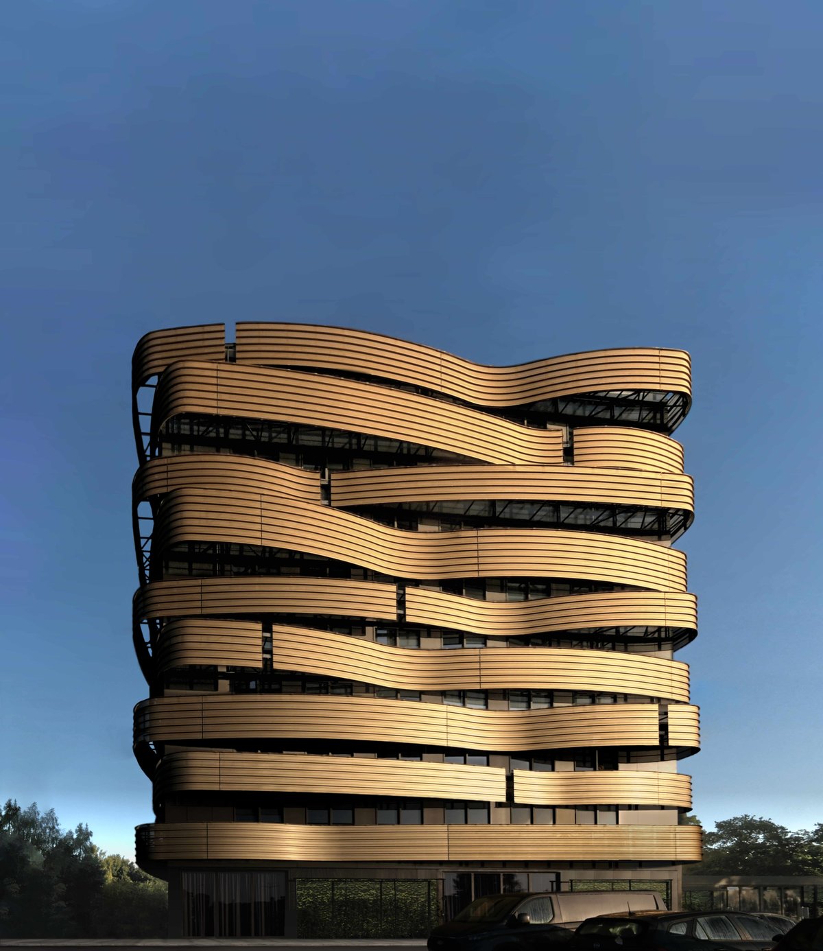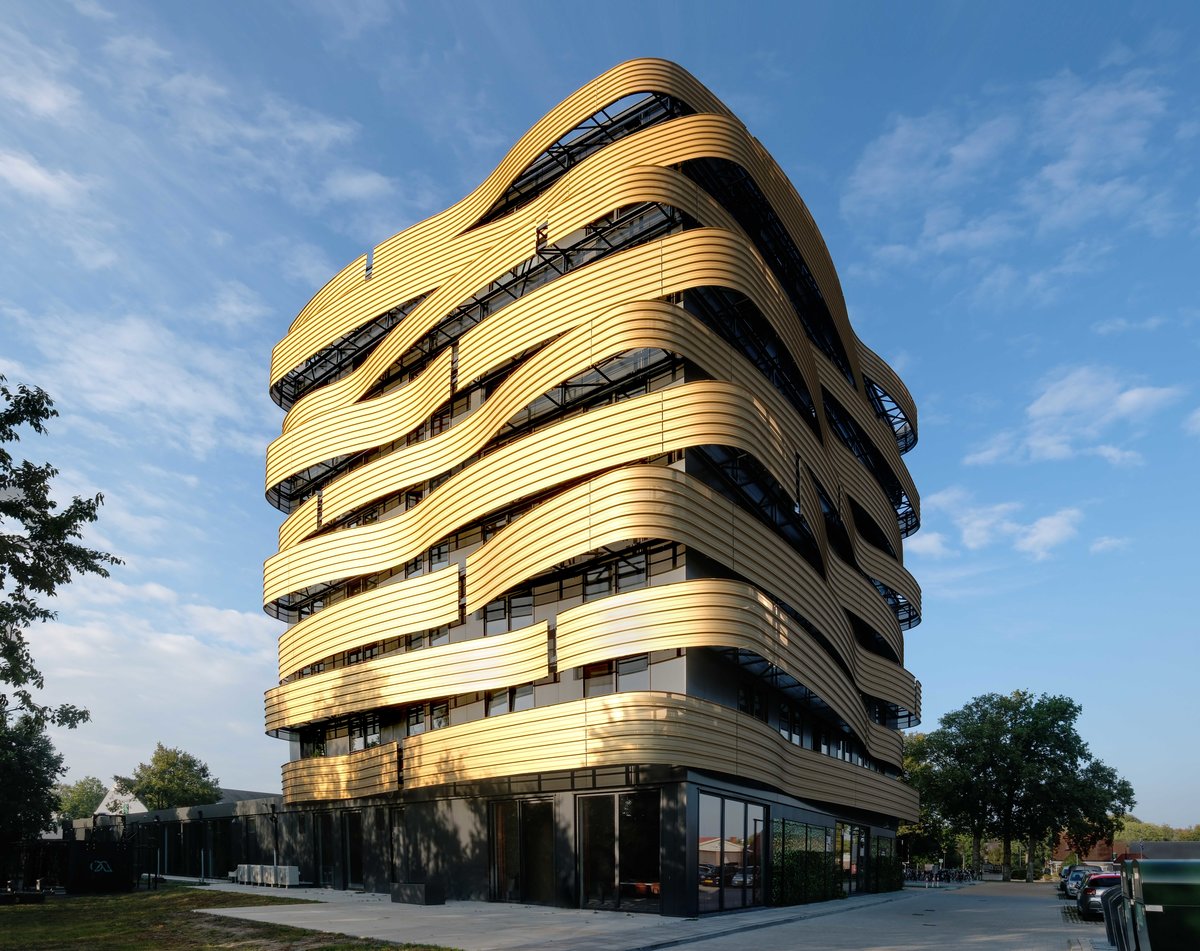 Een trotse toren van acht verdiepingen, smaakvolle en gedurfde architectuur met een duidelijke knipoog naar de sportieve omgeving. Want de brede ‘linten’ die als een sjaal om het gebouw lijken te slingeren, hebben ook wel iets weg van een stapel gouden plakken. De gevels van de begane grond zijn afwisselend van glas of met groen begroeid. Naar wens van de Gemeente Heerenveen om dit gebied groener te maken. Architect René van Zuuk en wij durfden het wel aan: een iconisch gebouw, dat tot de verbeelding spreekt.